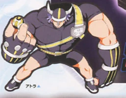 Atla's parents died early and so he has to raise his siblings by himself. He is generally a kind person but during battle he is unforgiving to his enemies. Despite his tough physique, he easily tires out, often saying "~mou" just like a cattle. His gigantic Bakugan may have overwhelmed Harubaru at first but the latter manages to defeat him.