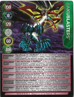 | Play before you roll a BakuBlaster. On any turn a BakuBlaster stands and shoots a BakuDisc, it gains the BakuDisc's printed G-Power. If your BakuDisc hits a standing opponent, your opponent's Bakugan loses -60 G-Power. | ||
